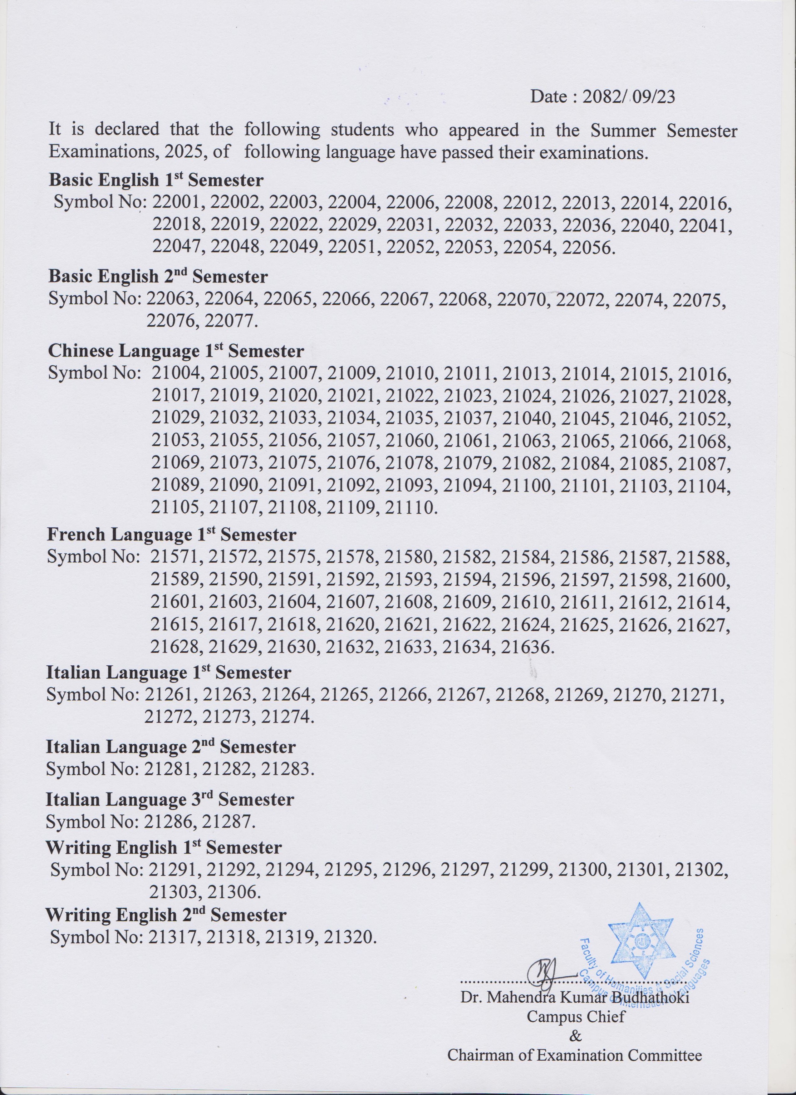 Result(Basic English- I&II, Writing English- I&II, French-I, Chinese-I, Italian-I,II&III)